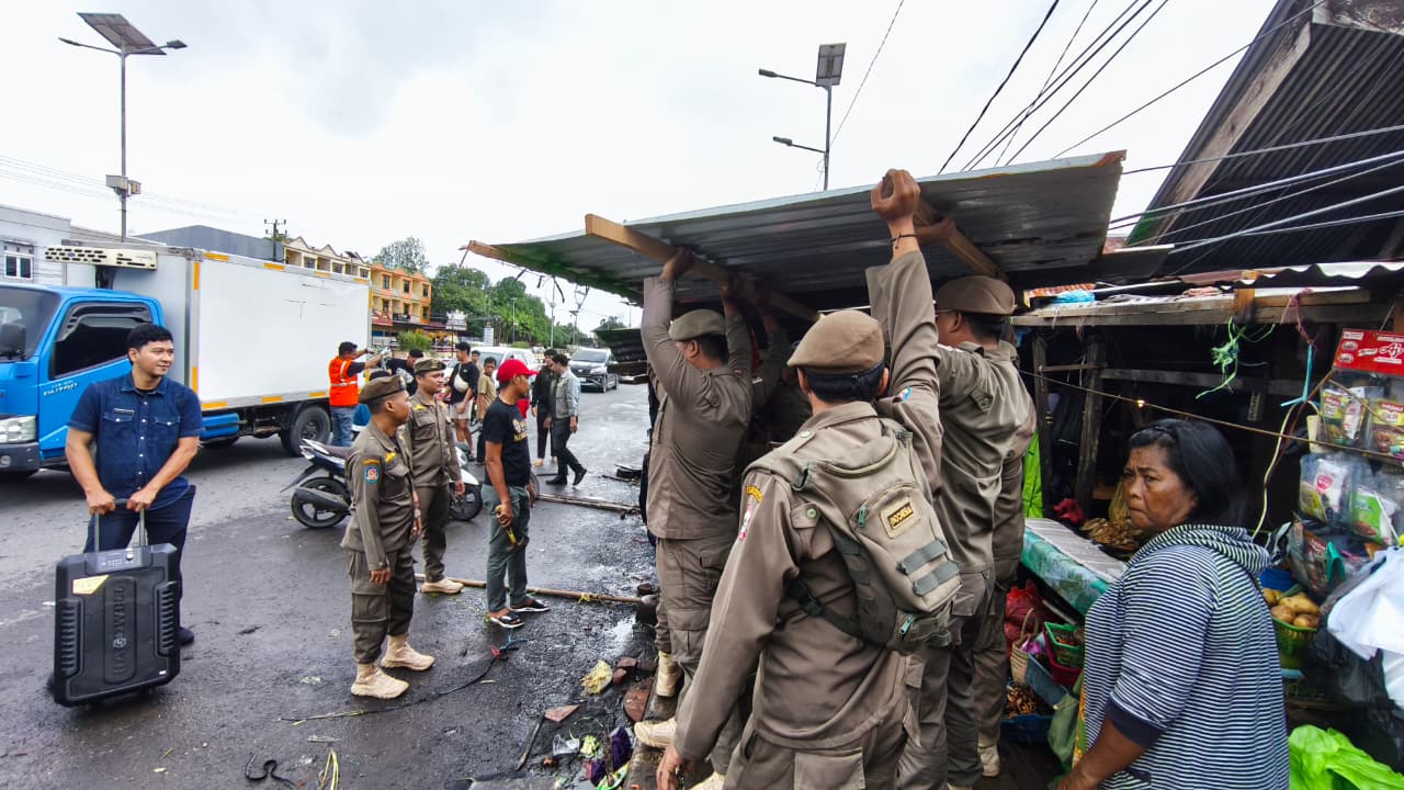 Selama proses penertiban, petugas melakukan pembongkaran secara bertahap dan persuasif. Sejumlah pedagang tampak mengamankan barang dagangan mereka sebelum lapak dibongkar oleh petugas.
